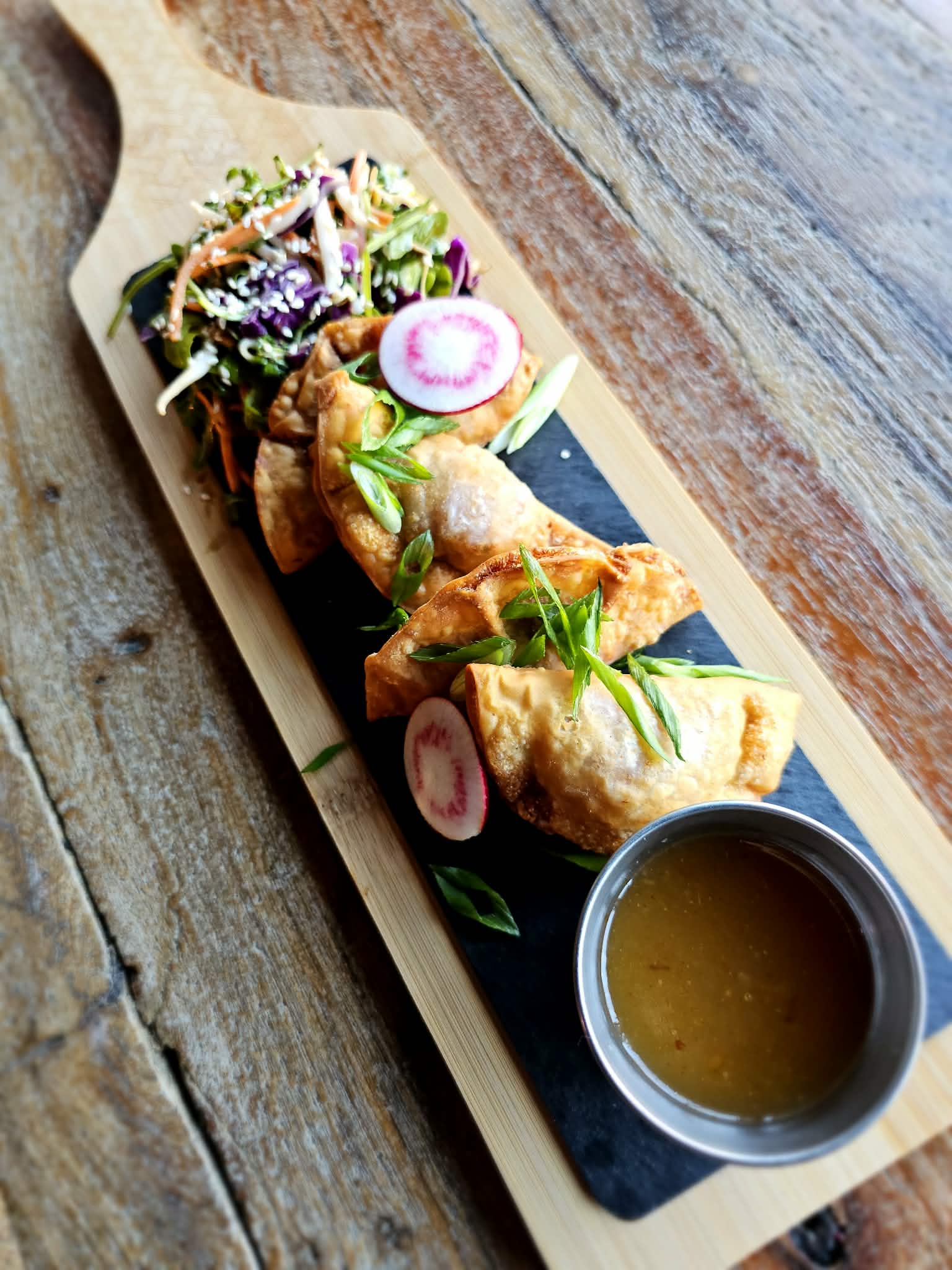 Dumplings frits, cuisse de canard confites, sauce thai au fond de canard, salade asiatique.Croustillant de feta ❤️ 🌱