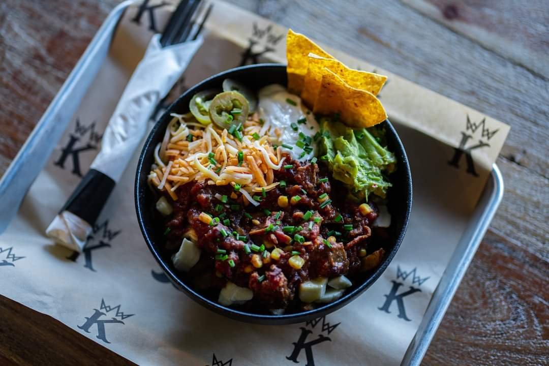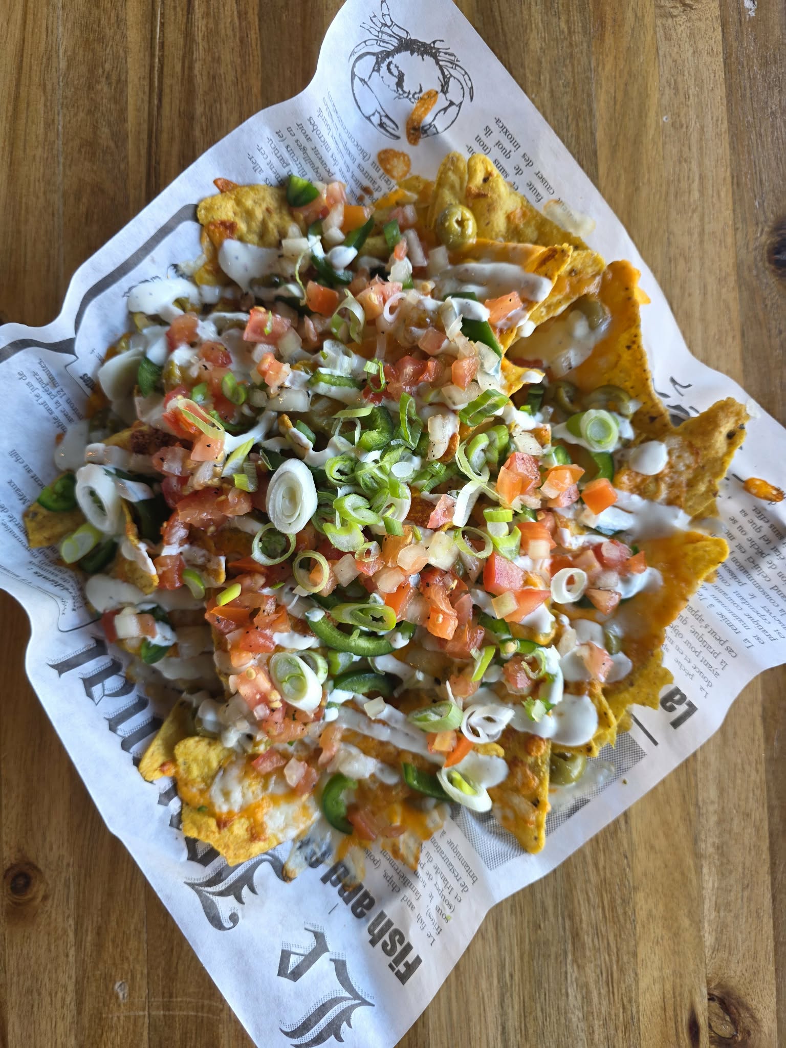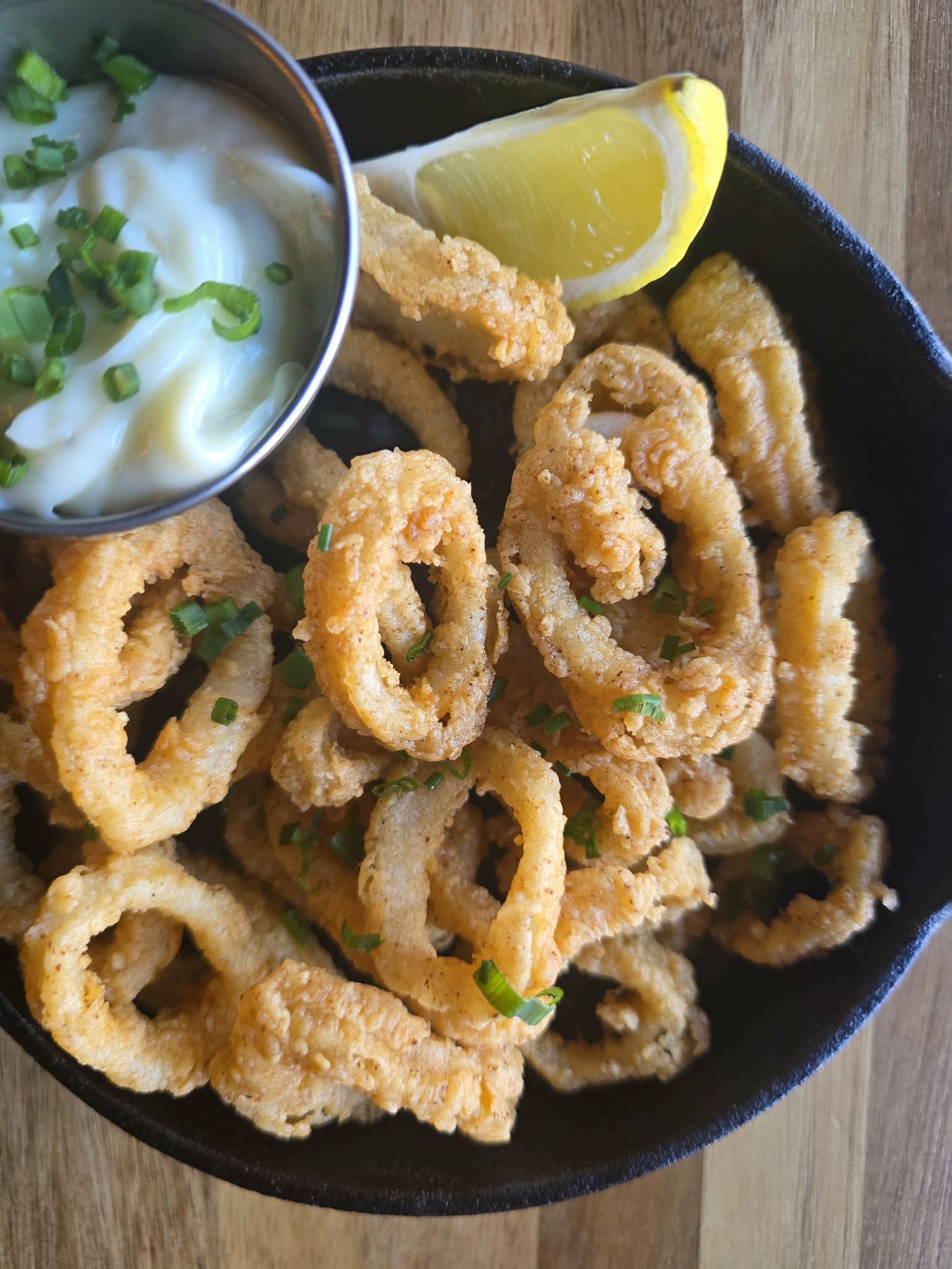Chili full viande, fromage, crème sûre, jalapeño frais, bruschetta, oignon vert et chips de mais. CALMARS FRITS