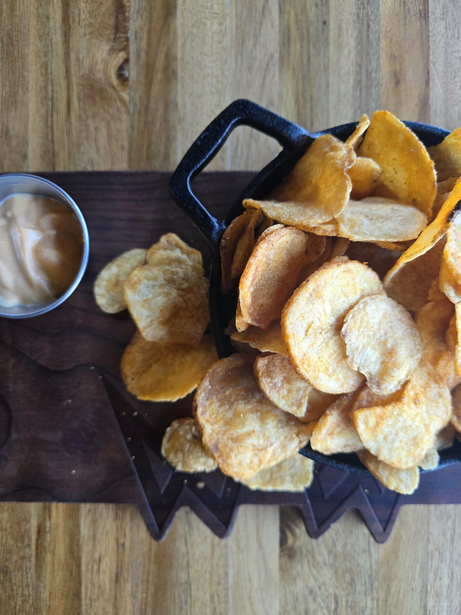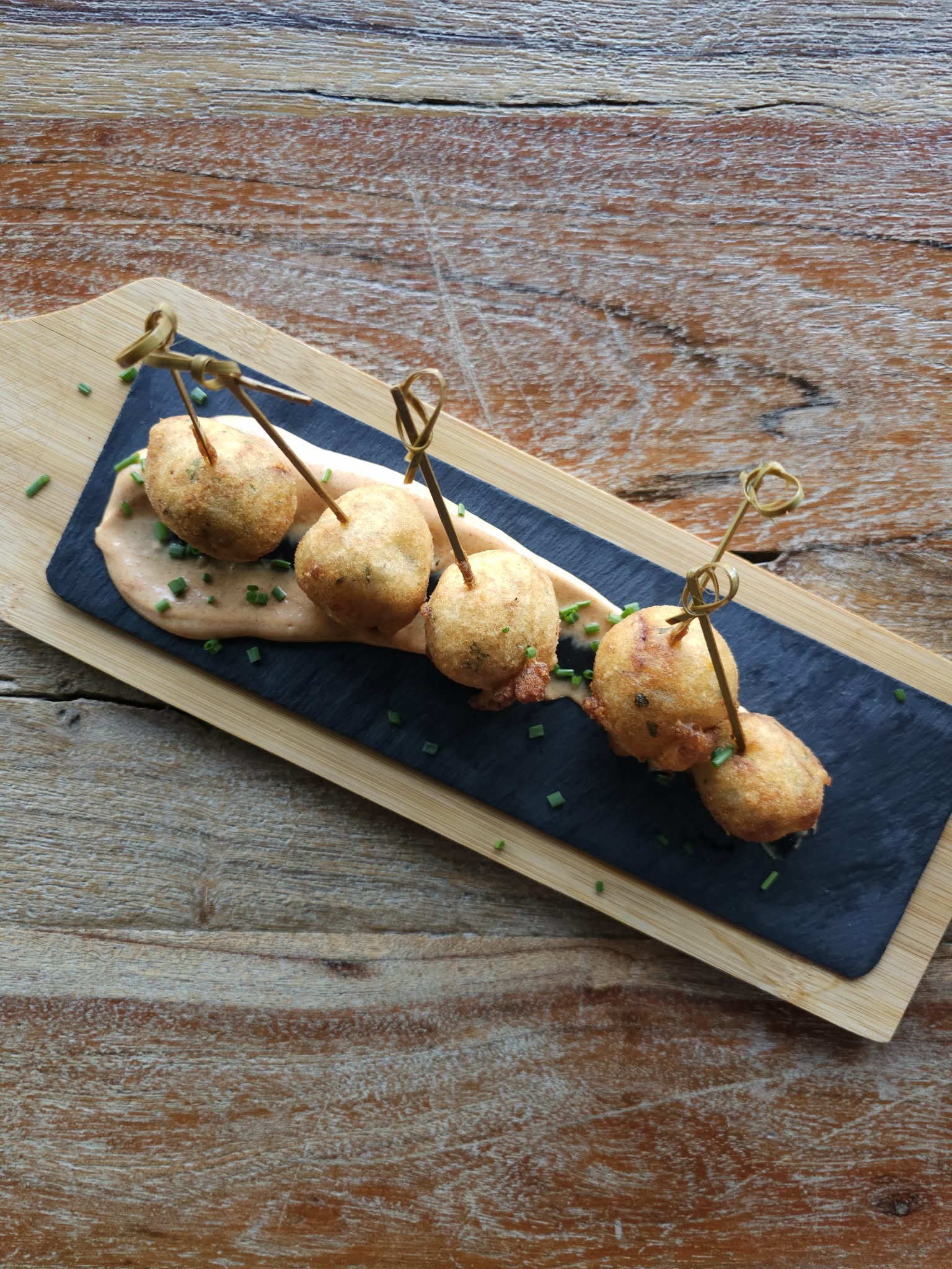 4 boules croustillantes de purée de pommes de terre, farcies de chorizo épicé de Cochon 100 façons et fromage fondant, servies sur une crème sûre jalapeño. Cornichons frits 🌱