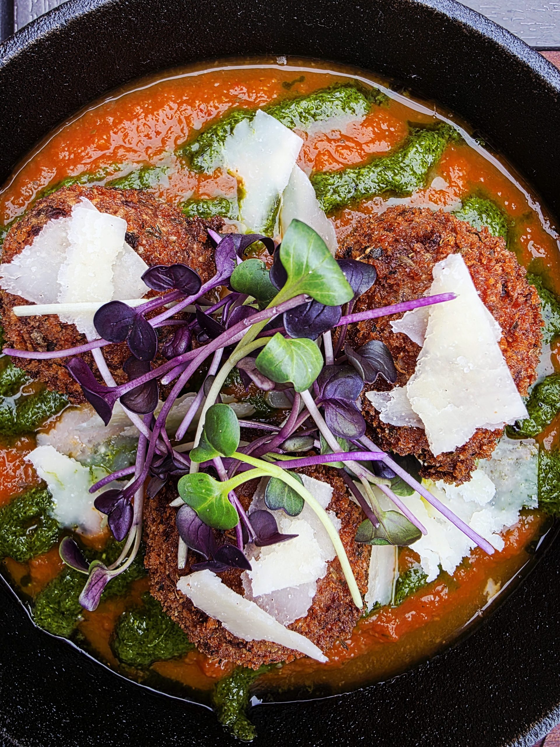 Arancini tomate-basilic, mozzarella fondante, sauce napolitaine, pesto de basilic, roquette et parmesan.Soupe à l'oignon du Melk
