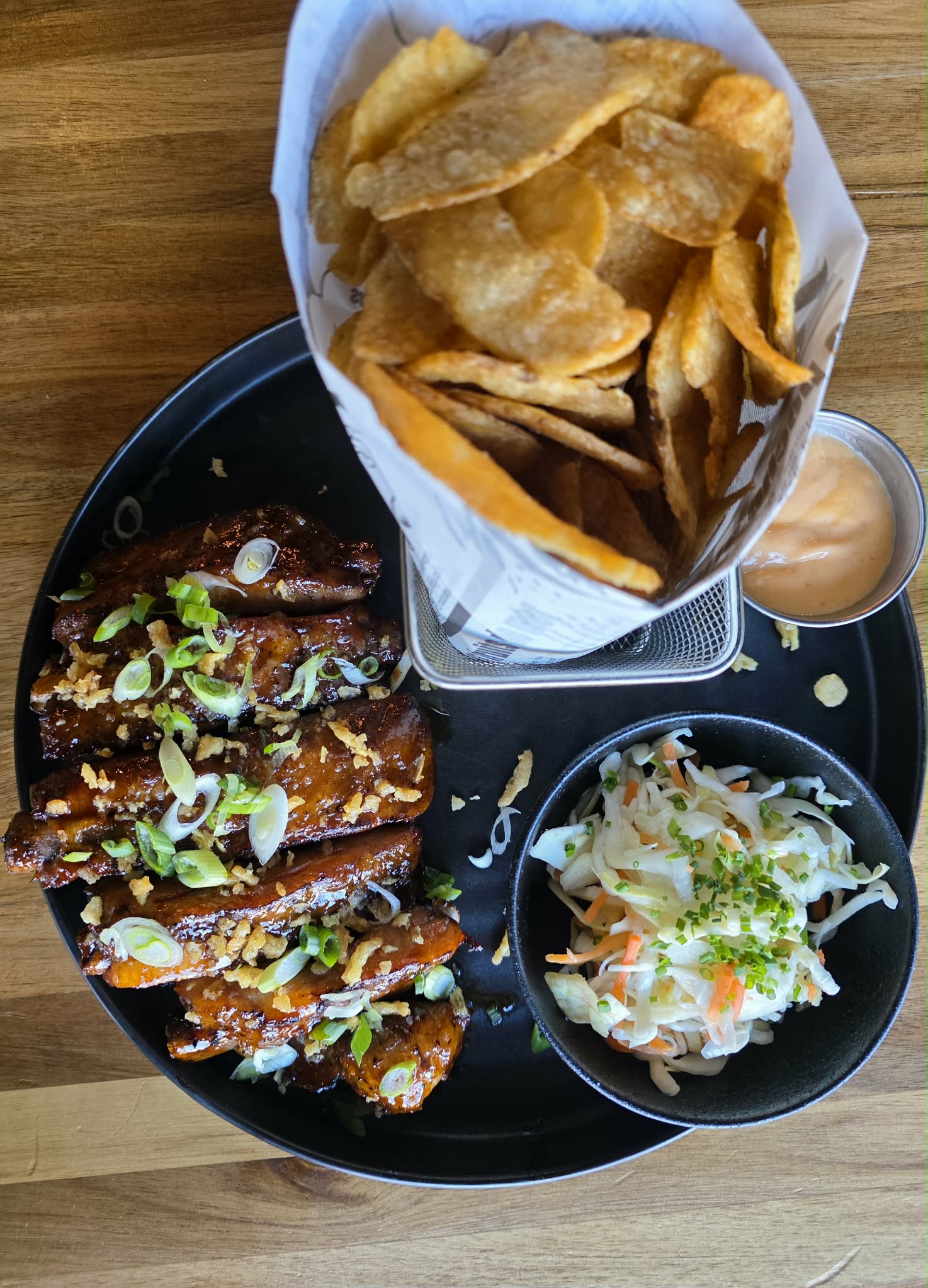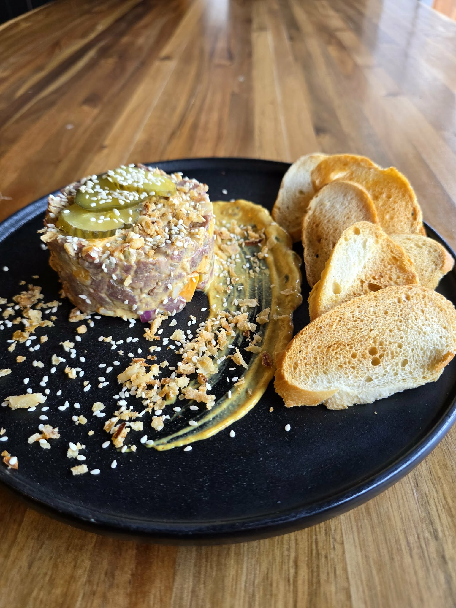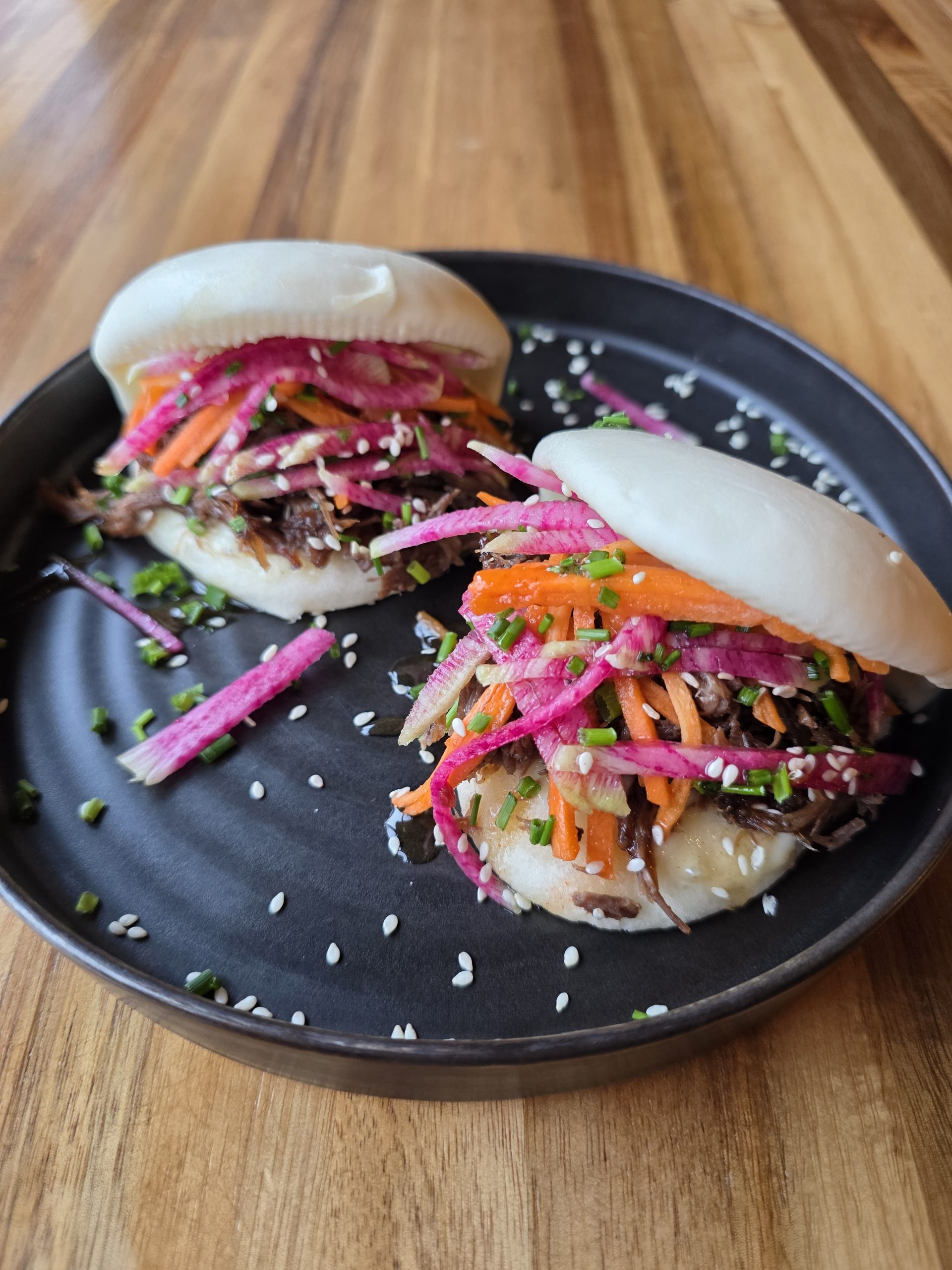 Pains bao (2), bœuf braisé, aïoli, carotte, radis melon, miel épicé et sésameGuacamole maison 🌱✳️