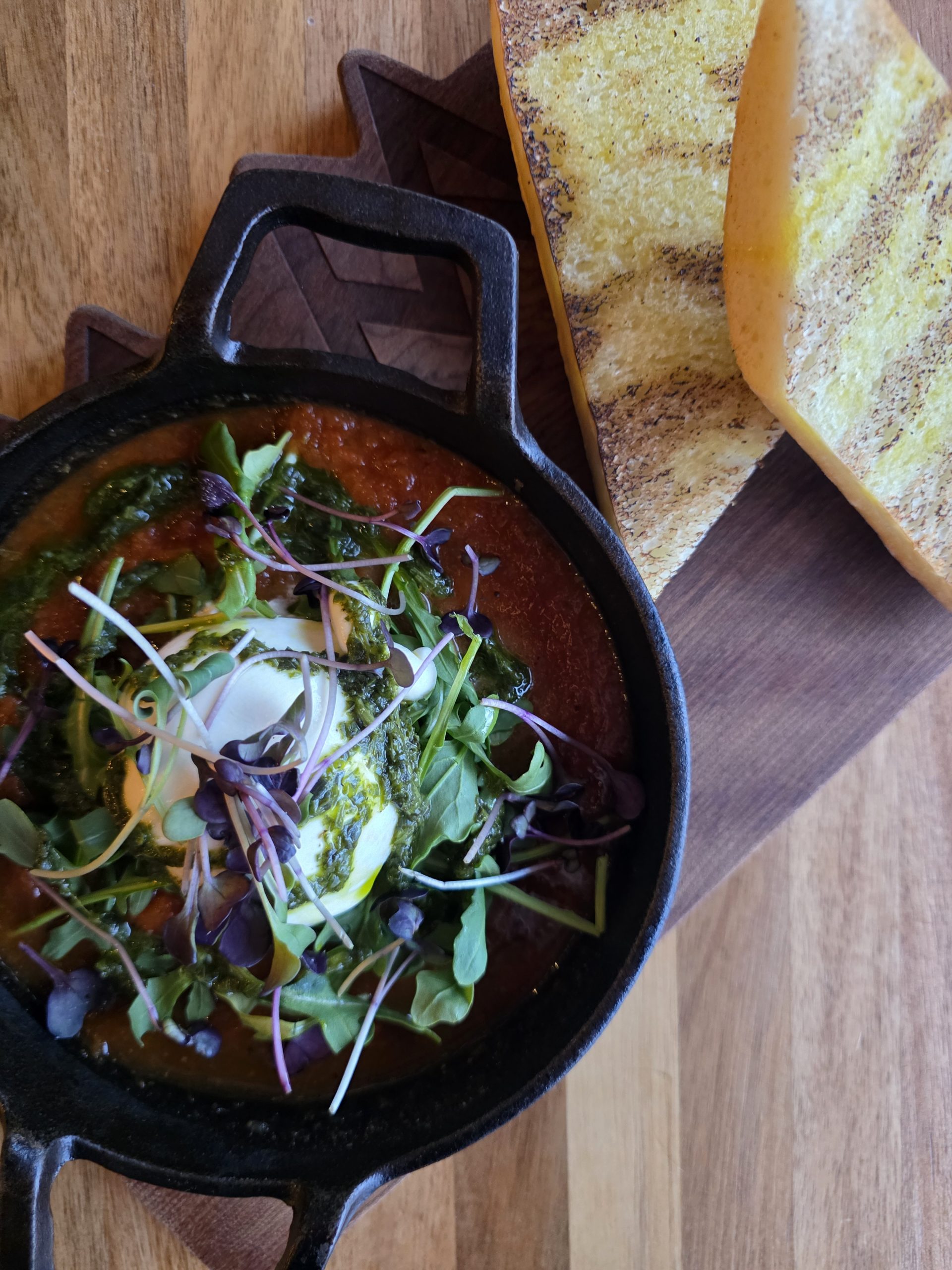 Riche bouillon de boeuf à la bière ''Irish red ale'' de Mille iles, flanc de porc braisée, oignon, thym, croûtons de pain et fromage racletteChorizo Bombas