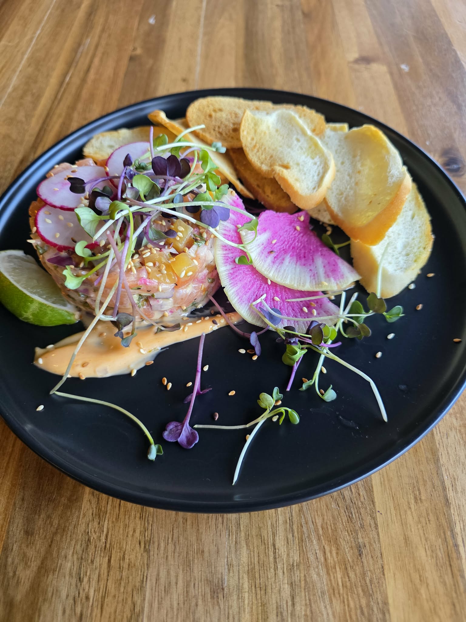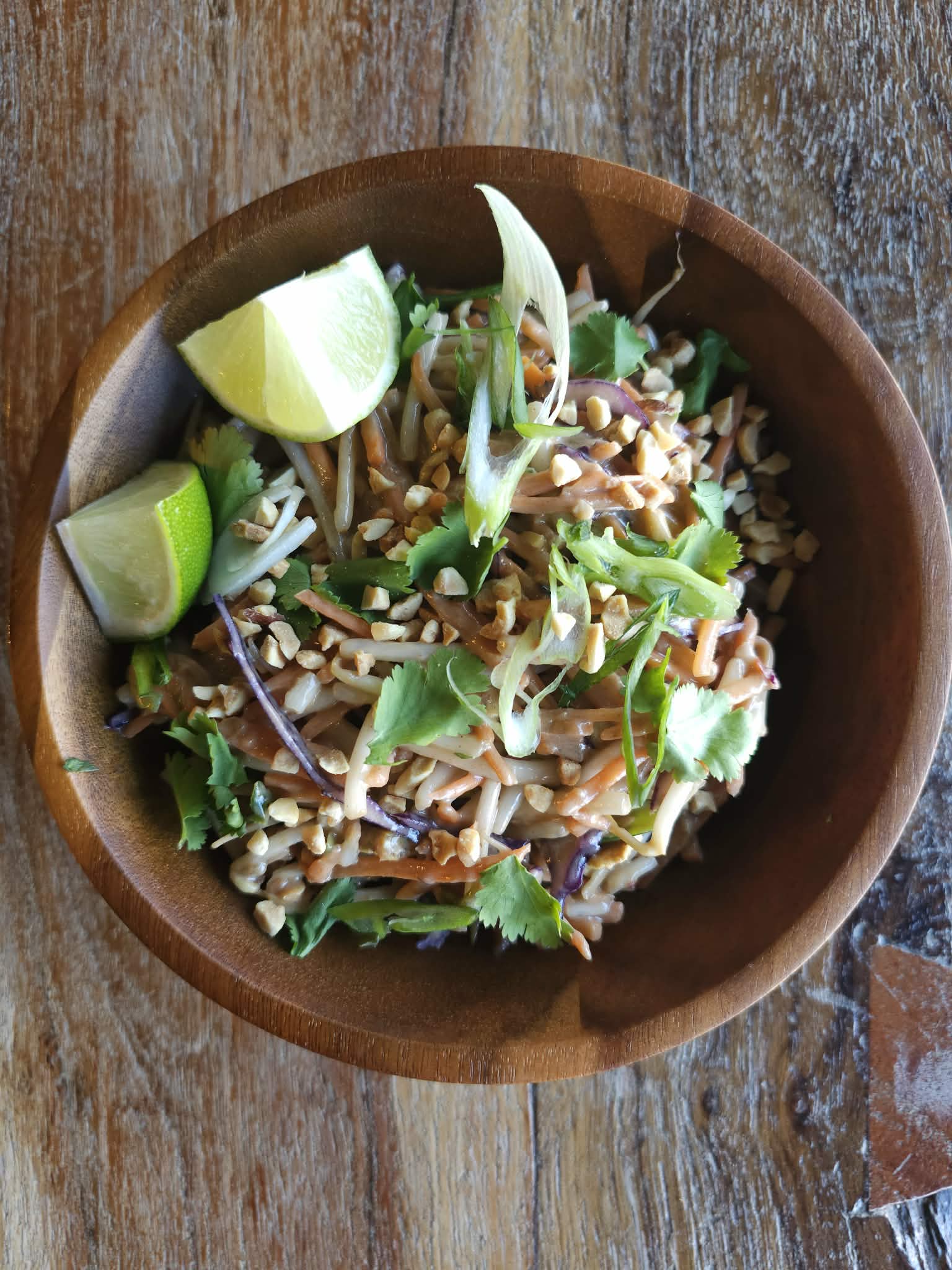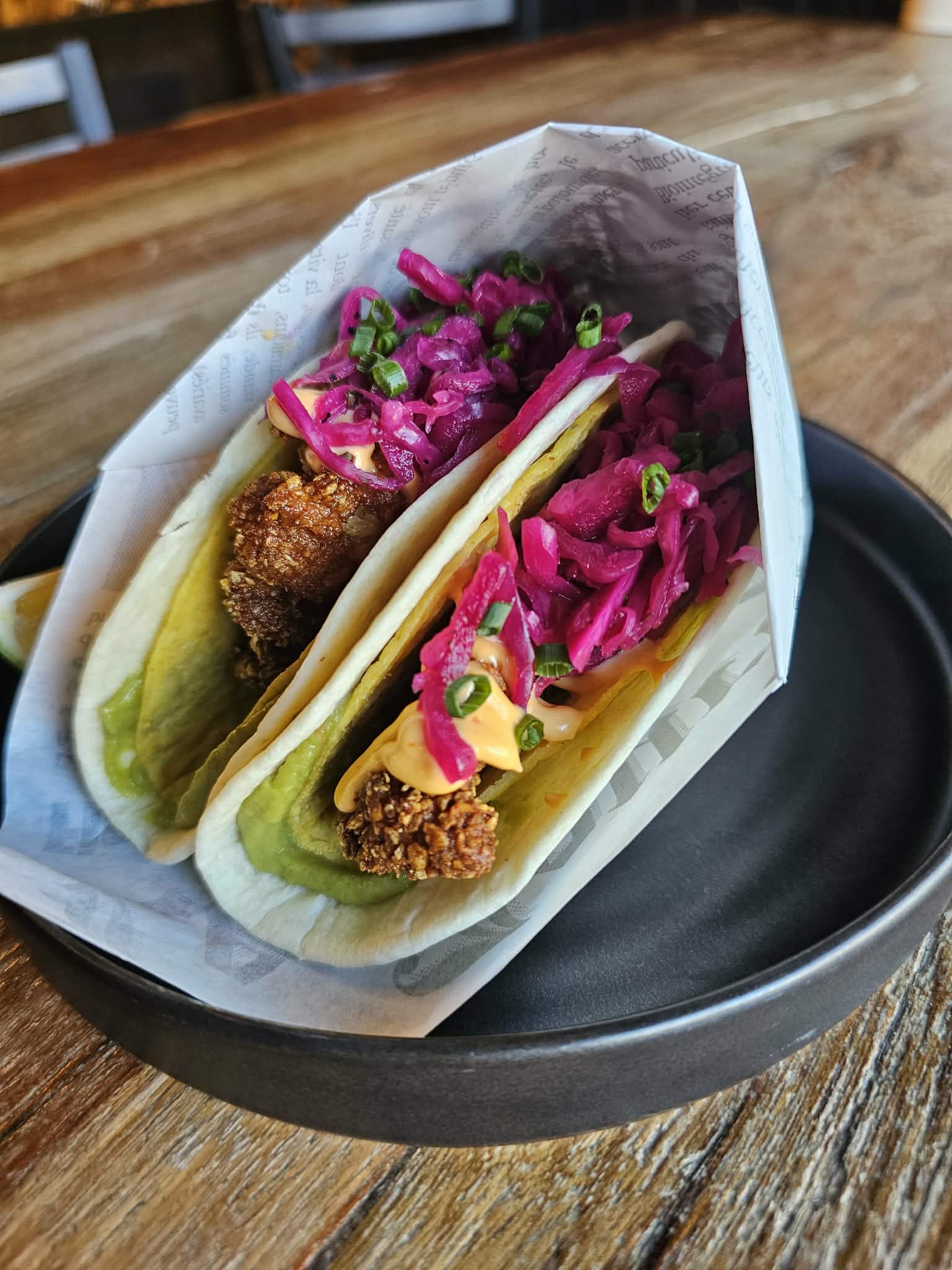Salade tiède croquante aux arachides, carottes, fèves germées, chou rouge, émietté de tofu, oignons verts, arachide, coriandre, sésames et lime.TACOS BANG BANG (2) ❤️