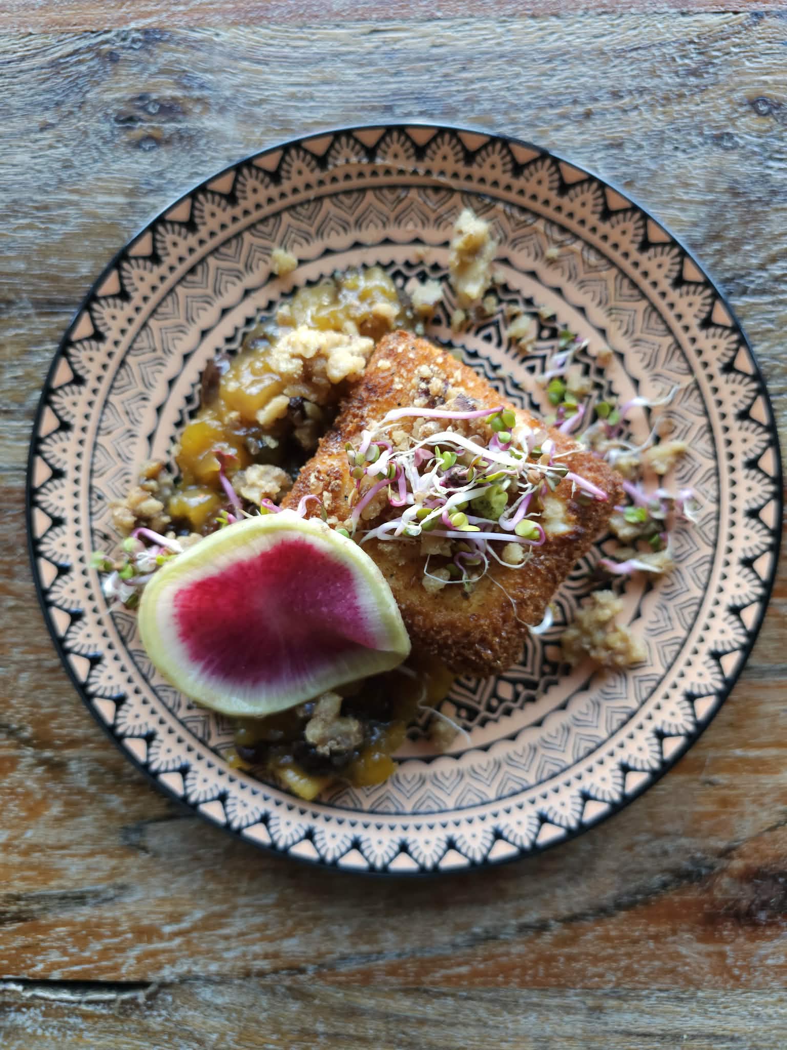 Feta croustillant, chutney de pomme et canneberge, noix de Grenoble caramélisé, miel épicé et pousse.