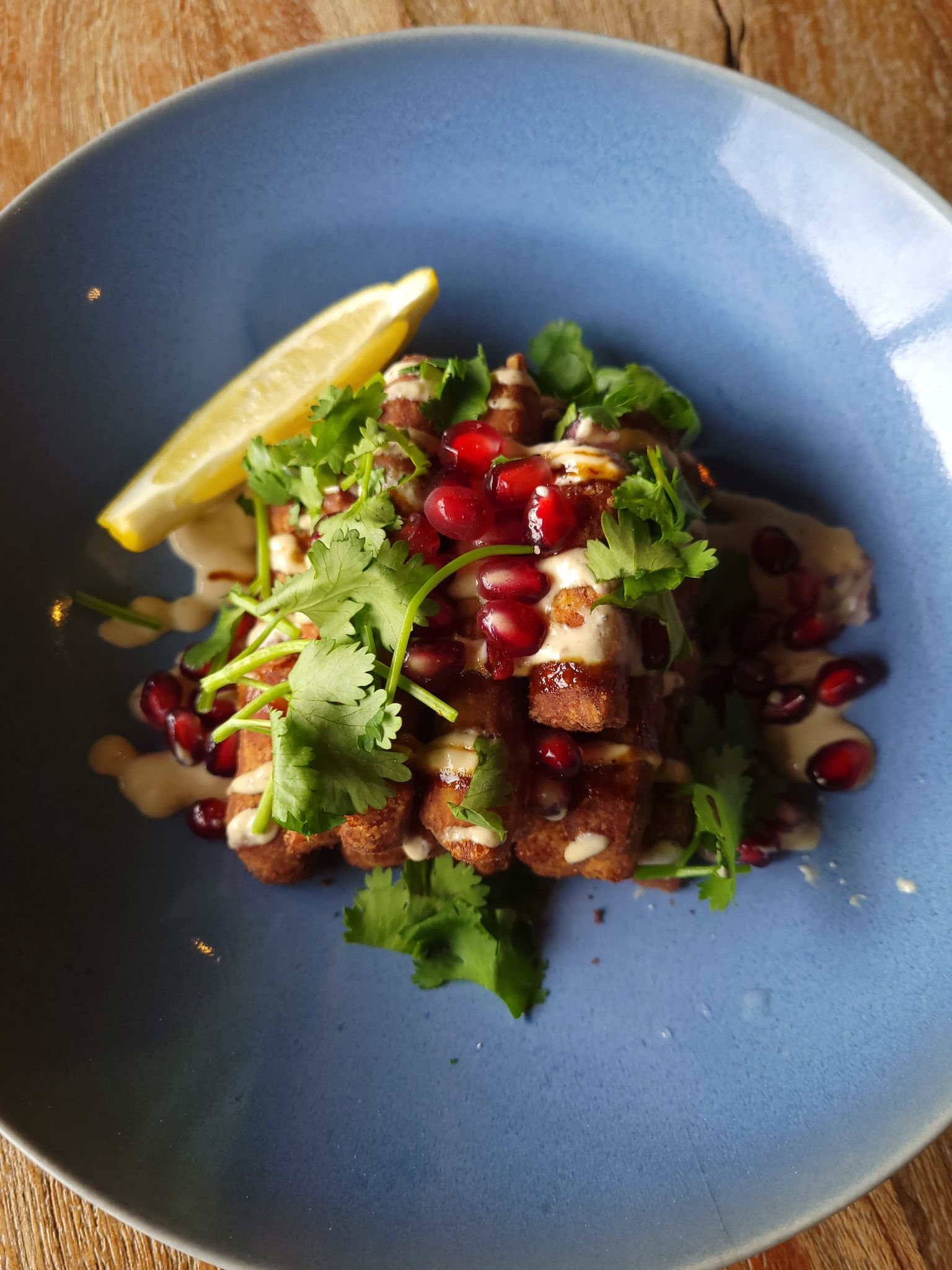 Bâtonnets d'halloumi frits, crème sûre citron et sumac, mélasse de grenade, pomme grenade, coriandre (option sans coriandre).