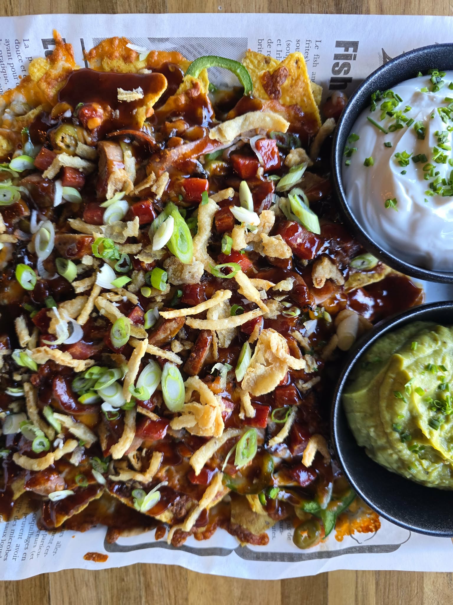 Tacos de poulet et sa croustillante panure aux Doritos, tortillas souple ET rigide, guacamole, salade de chou à la mexicaine, sauce Bang Bang et miel épicé. Dumplings de confit de canard ❤️