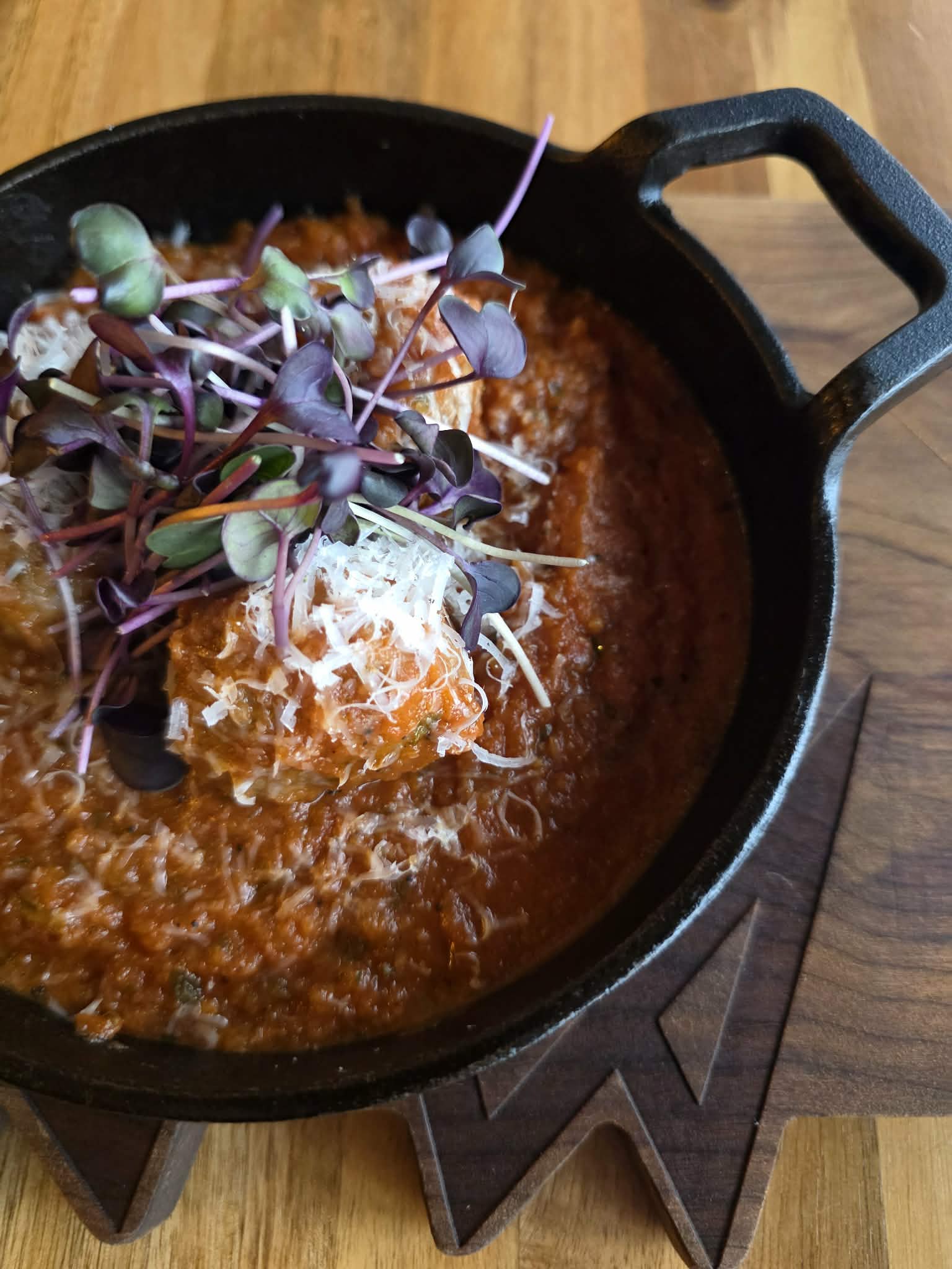 Sauce napolitaine, pesto, roquette, burratini et croûtons de painPolpette al sugo