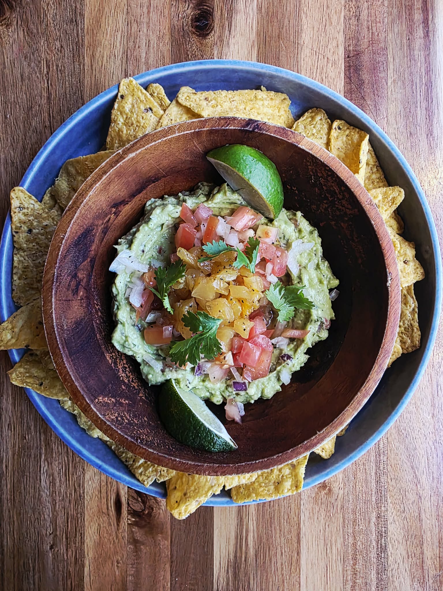 Guacamole maison, bruschetta, chutney d’ananas, coriandre et chips de mais.